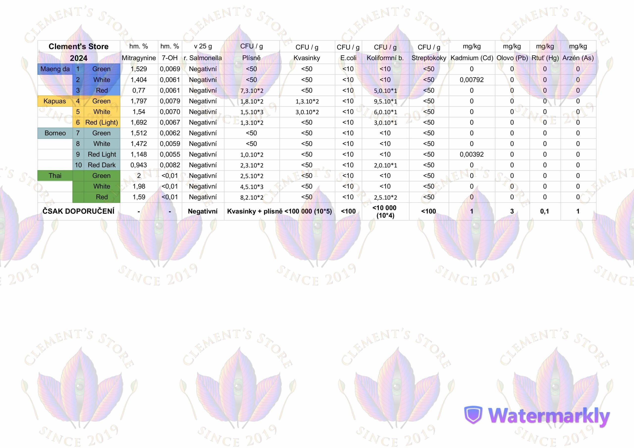 Napravo jsou výsledky našich vlastních laboratorních testů tří homogenizovaných prášků dle barvy – bílý, zelený a červený. Vzali jsme od každého dodavatele jednotlivou barvu a namíchali společně v poměru 1:1:1:1. V tomto mixu byl prášek od všech dodavatelů v dané době (zdroje Maeng Da, Borneo, Kapuas a Kalimantan).